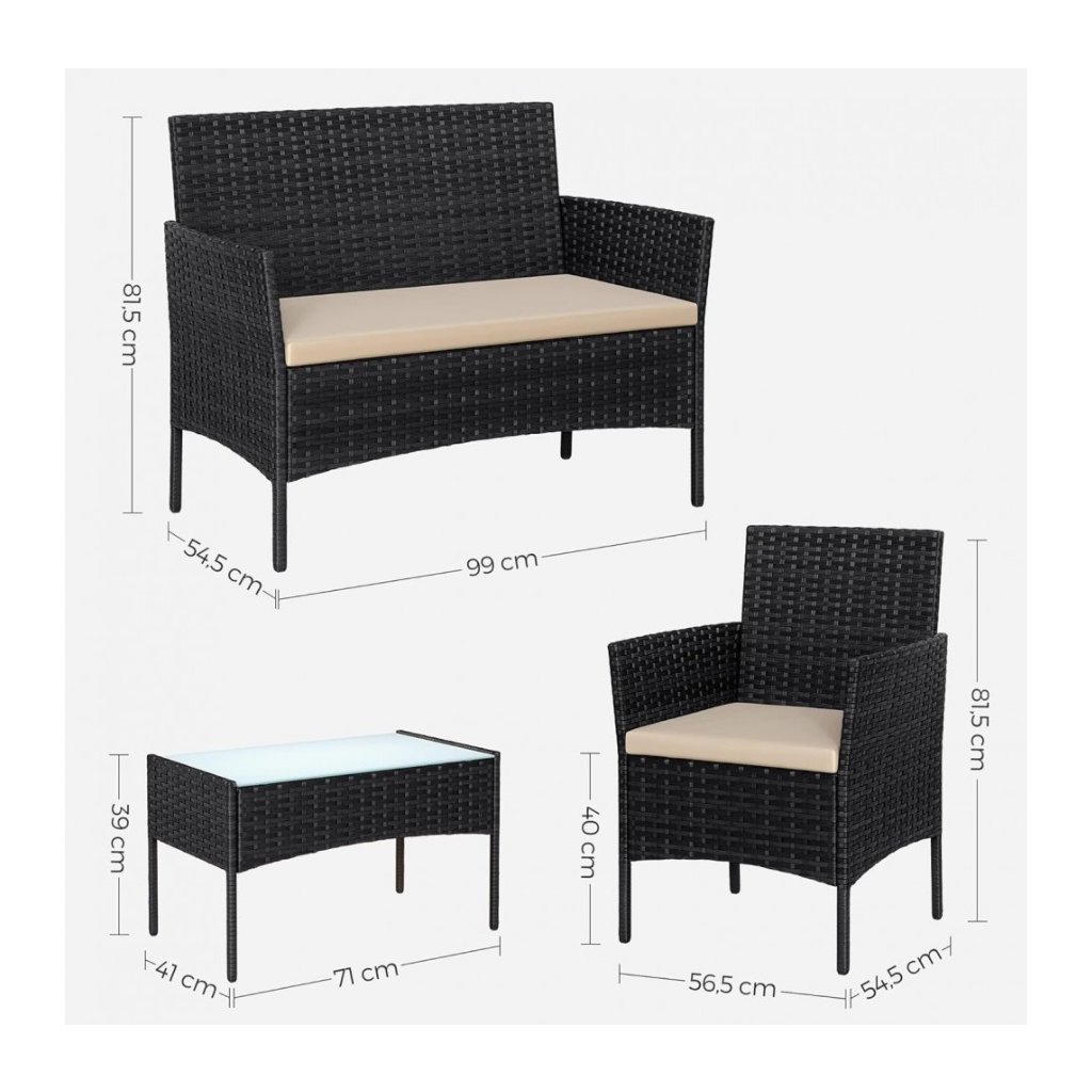 Základem tohoto zahradního setu je pevná ocelová konstrukce , která je pokryta kvalitním technoratanem . Tento ratan má tloušťku 8 × 1,1 mm, je odolný, pružný a dokonale vhodný pro celoroční venkovní použití . Podušky jsou vyrobeny z 180 g voděodolného polyesteru a jejich výplň tvoří pěnová hmota o tloušťce 5 cm, která zajišťuje maximální komfort při sezení .