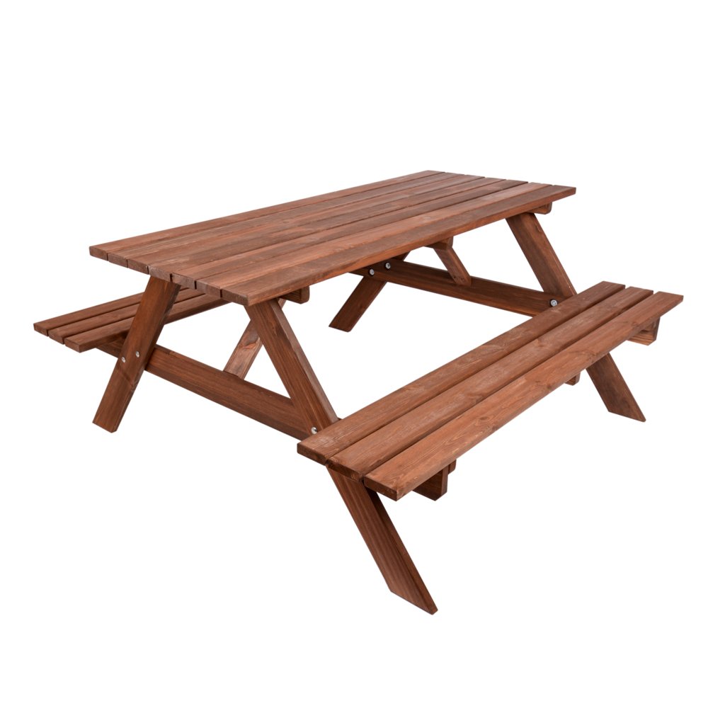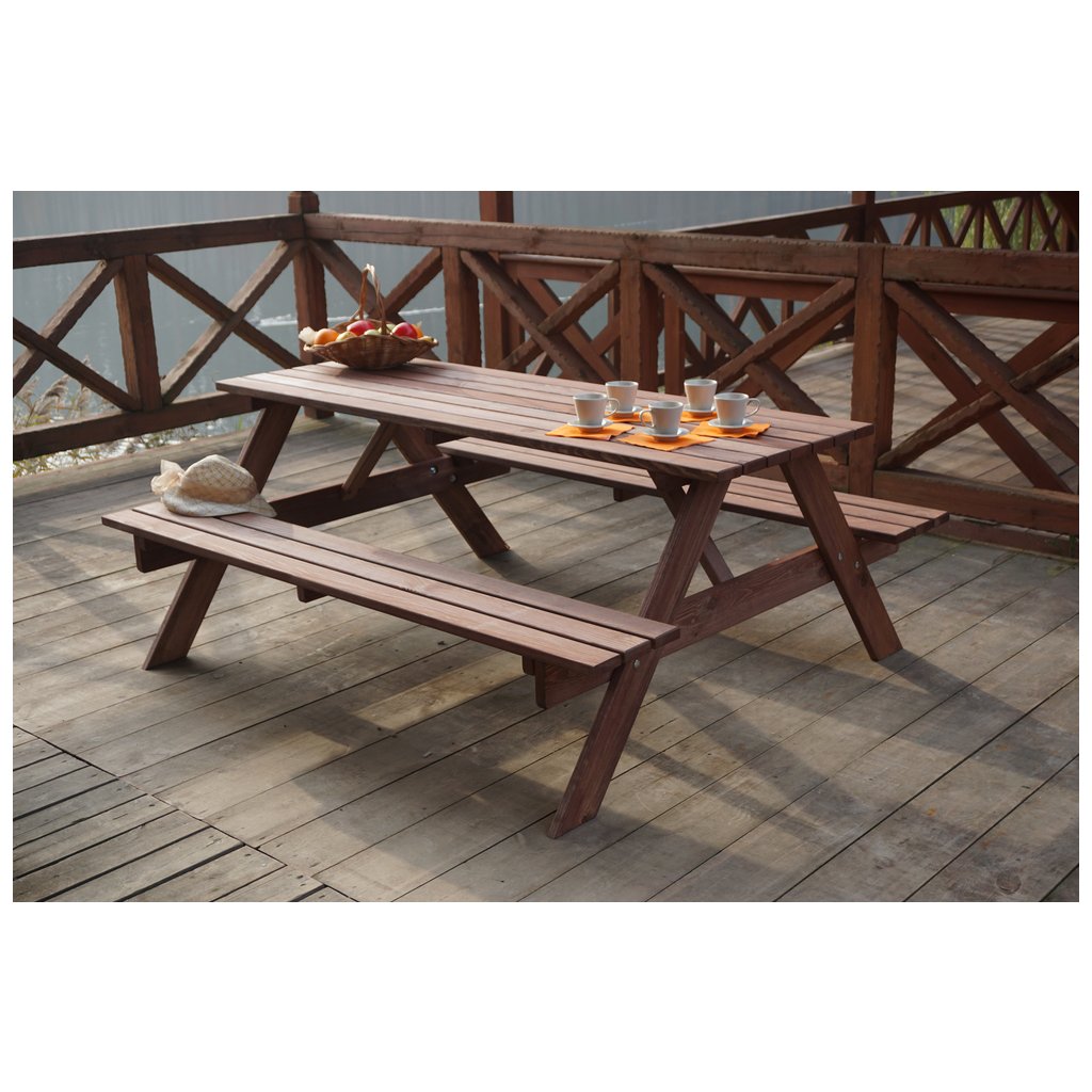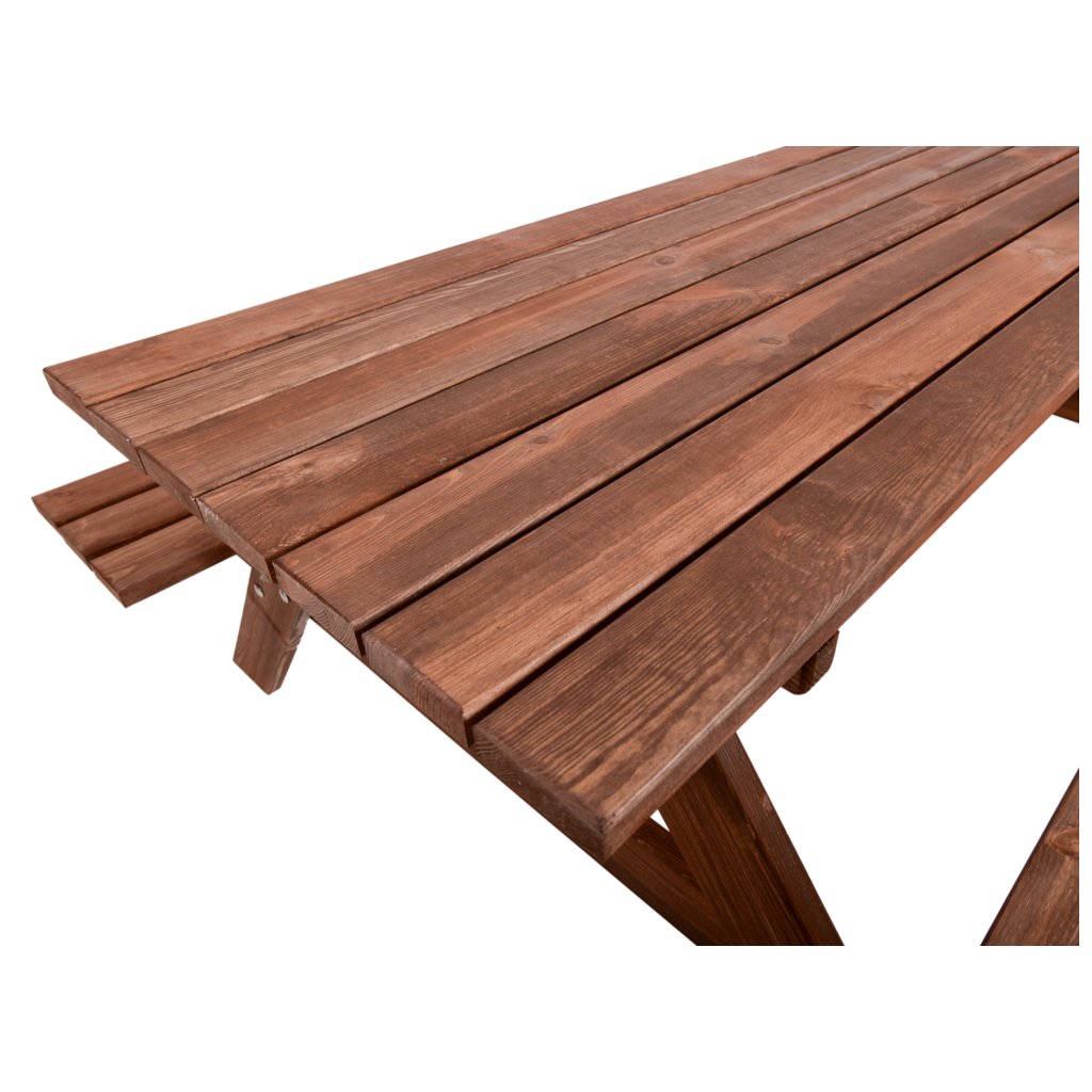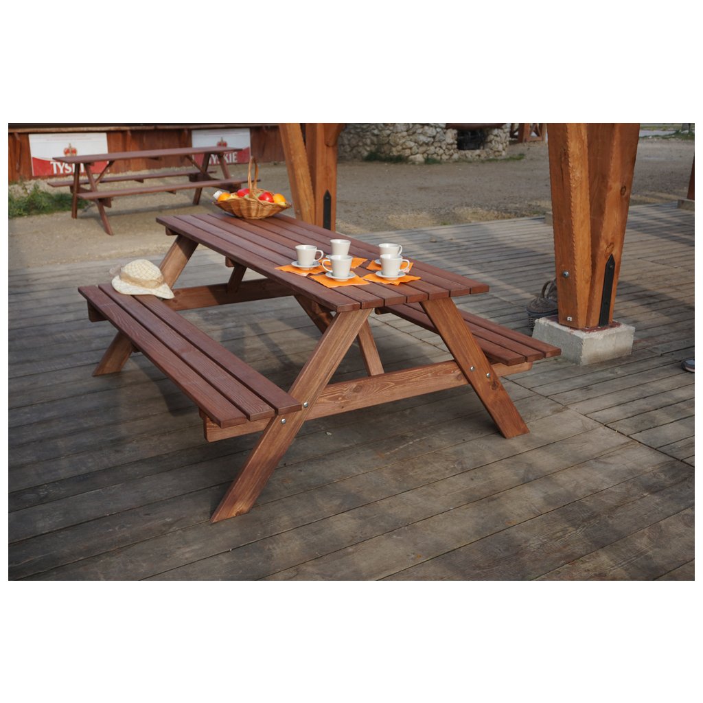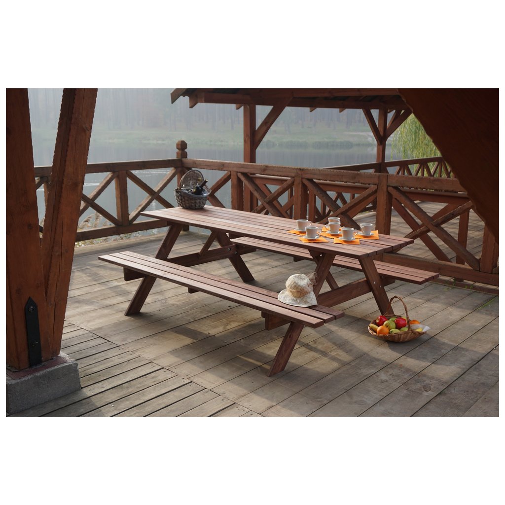 Zahradní sestava PIKNIK je zhotovena z kvalitního borovicového dřeva o tloušťce 3 cm, díky čemuž je nosnost každé lavičky 240 kg a nosnost stolu 100 kg. Dřevo je mořeno do kaštanové barvy. Impregnovaný povrch zaručuje ochranu a delší životnost dřeva. Sestava se skládá ze stolu a dvou lavic, které jsou připojeny ke stolu. Piknikový stůl je mimořádně vhodný pro zahradní večírky, grilovačky a jiné exteriérové slavnosti ve vaší zahradě.