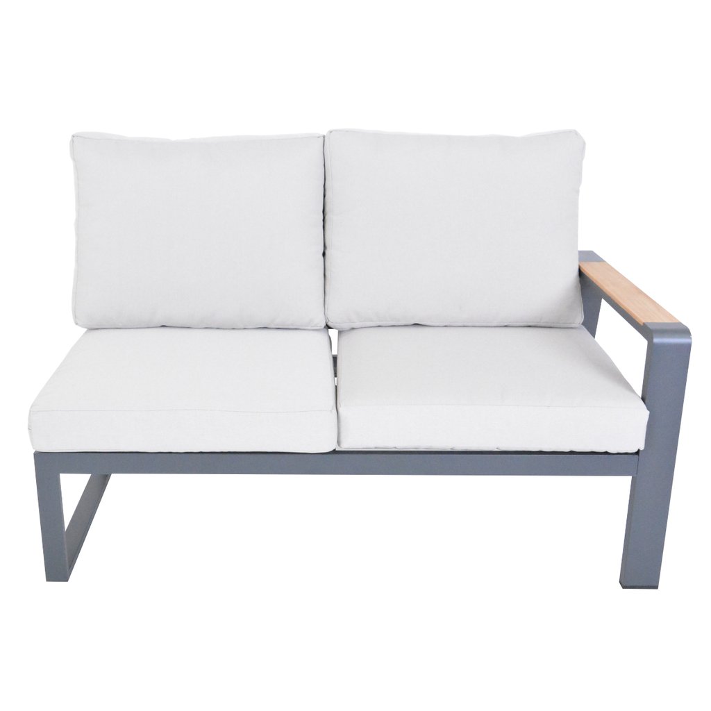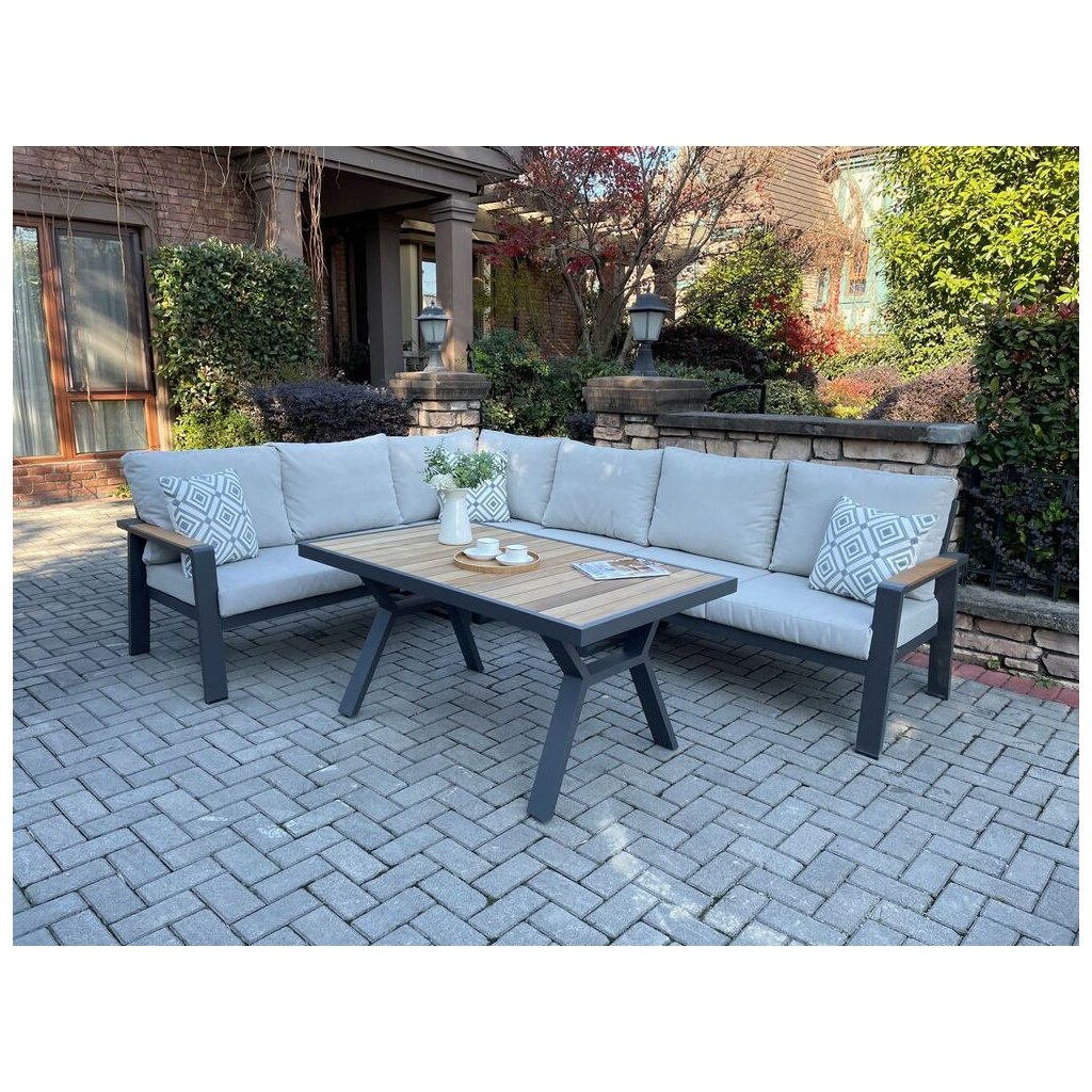Luxusní hliníková souprava ROTTERDAM v grafitové povrchové úpravě s područkami a deskou stolu z teakového dřeva obsahuje rohovou pohovku a praktický stolek. Moderní souprava , která se dokonale hodí do každého exteriéru nebo interiéru. Díky použitým materiálům a modernímu vzhledu má souprava opravdu široké možnosti použití, je vhodná do interiéru i exteriéru – do zahrad, na terasy, do zimních zahrad nebo i do uvítací haly či recepce. Díky jednoduché montáži budete moci soupravu po chvíli plně využívat. Distanční prvek lze umístit na levou nebo pravou stranu, a tak měnit délku pravé nebo levé části podle vašich potřeb . Součástí setu je 2x pohovka (levá a pravá), 1x rohová pohovka, 1x rozkládací pohovka, 1x stolek.