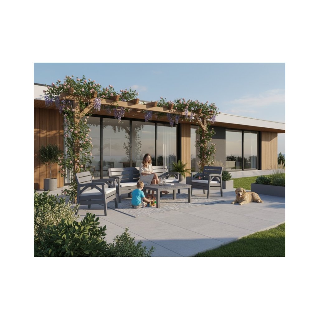 Elegancký zahradní set SANTANA v barvě antracit s béžovými poduškami nabízí více místa při zachování maximálního komfortu. Vytvořte si stylovou a pohodlnou relaxační zónu na zahradě, terase nebo patio. Set obsahuje dvě pohodlná křesla , prostornou třímístnou pohovku a praktický stůl, čímž tvoří kompletní a harmonický zahradní set . Třímístná lavice poskytuje ještě více místa pro společný relax s rodinou a přáteli . Teplá béžová barva podušek ladí s zelení zahrady a elegantní antracitový rám dodává soupravě klasický, nadčasový vzhled. Set je ideální pro klidnou chvíli u kávy i pro letní setkání s hosty.