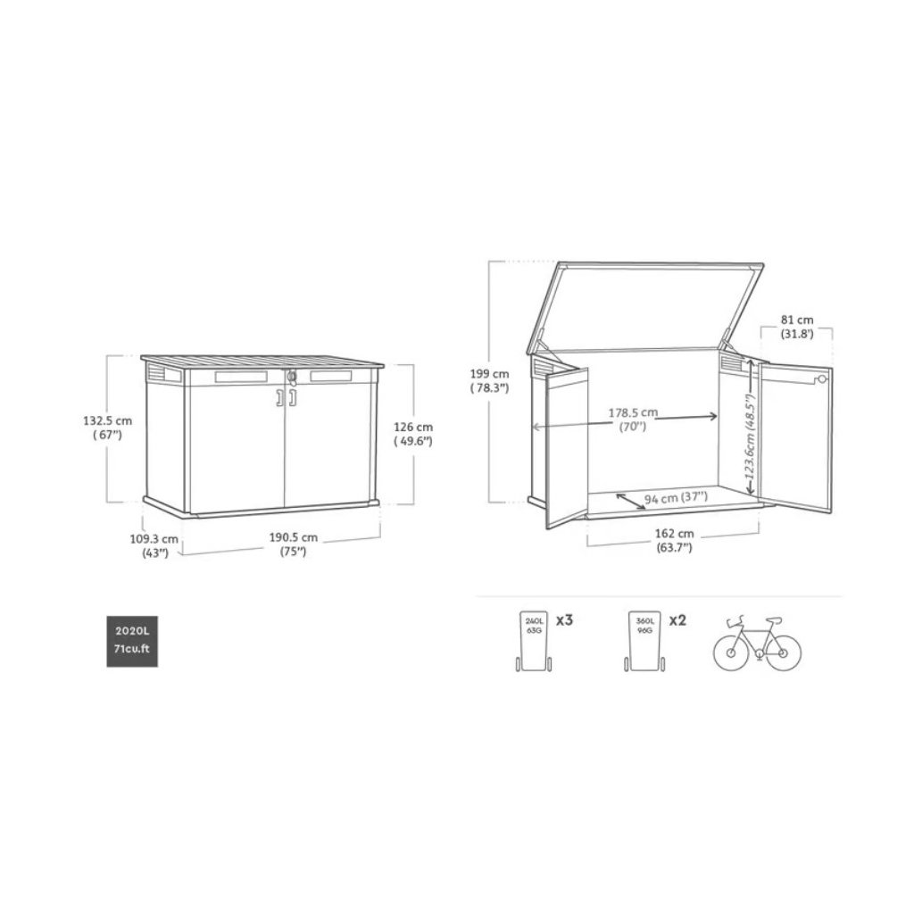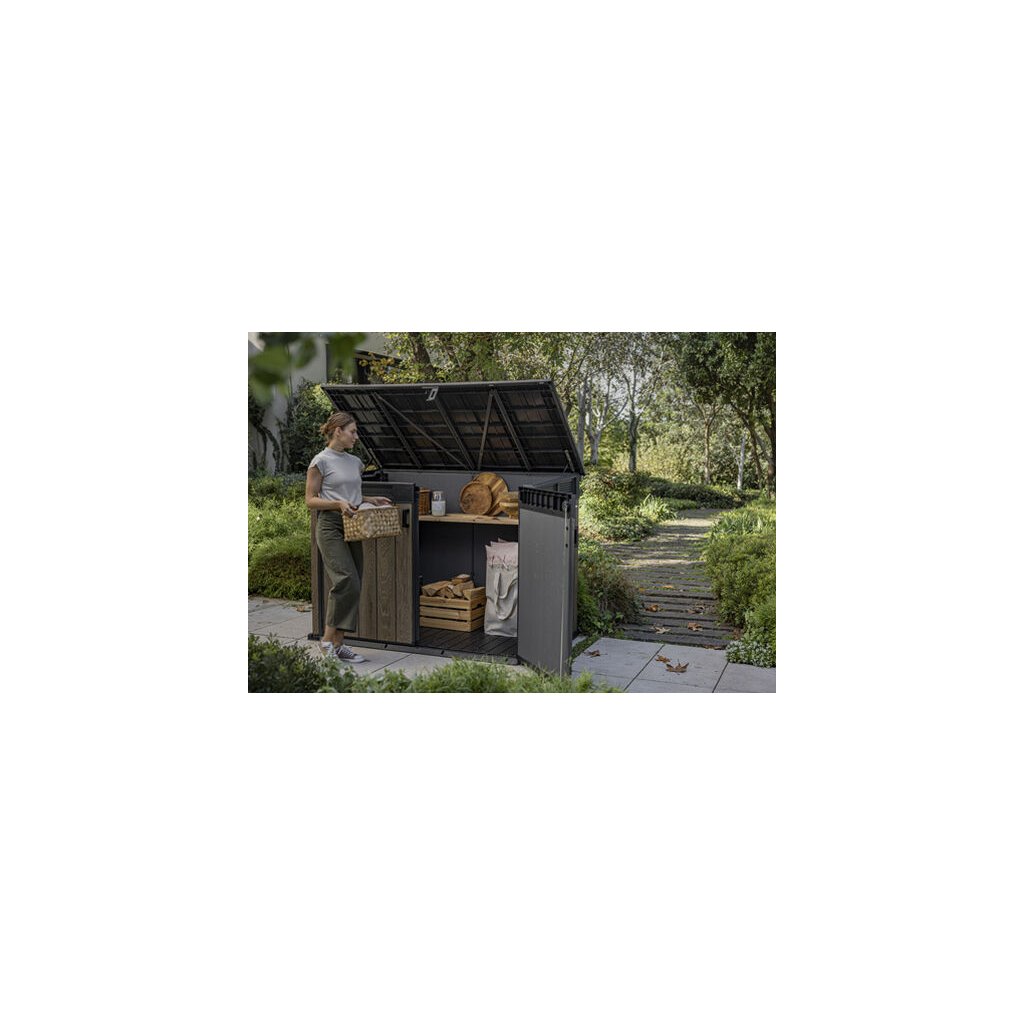 Zahradní skříňka SECTION BOX nabízí rustikální vzhled dřeva v různých odstínech, moderní a zároveň praktická skříňka bude stylovým doplňkem pro každou zahradu nebo terasu. Skříňka má bohatý úložný prostor v objemu 2020L pro uskladnění zahradního nářadí nebo popelnic. Otevírání je zajištěno formou hydraulických pístů , dovnitř se vejde 2x 360L nebo 3x 240L smetný koš. Zabudovaná ventilace chrání skříňku před nepříjemnými pachy. Uvnitř je police, dvojitá dvířka mají možnost uzamčení visacím zámkem (zámek není součástí balení).