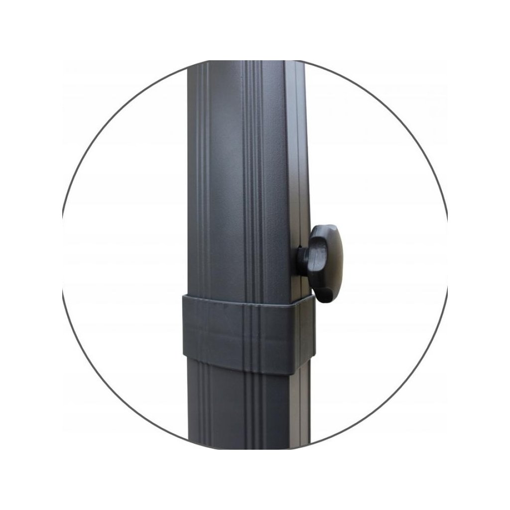 Stojící profil je vyroben z kvalitního hliníku s povrchovou úpravou práškovým lakováním . Zavěšený profil také sestává z hliníku a je ošetřen stejnou práškovou barvou, která zaručuje odolnost a estetický vzhled . Stabilitu zajišťuje podstavec s křížovou základnou z robustní oceli, která poskytuje spolehlivou oporu. Stříška je z voděodolného materiálu poskytuje spolehlivou ochranu před nepřízní počasí. Jednoduché skládání a rozkládání umožňuje praktická klika.