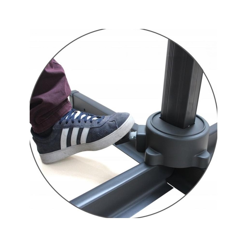 Stojící profil je vyroben z kvalitního hliníku s povrchovou úpravou práškovým lakováním . Zavěšený profil také sestává z hliníku a je ošetřen stejnou práškovou barvou, která zaručuje odolnost a estetický vzhled . Stabilitu zajišťuje podstavec s křížovou základnou z robustní oceli, která poskytuje spolehlivou oporu. Stříška je z voděodolného materiálu poskytuje spolehlivou ochranu před nepřízní počasí. Jednoduché skládání a rozkládání umožňuje praktická klika.
