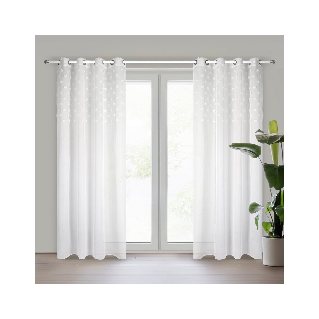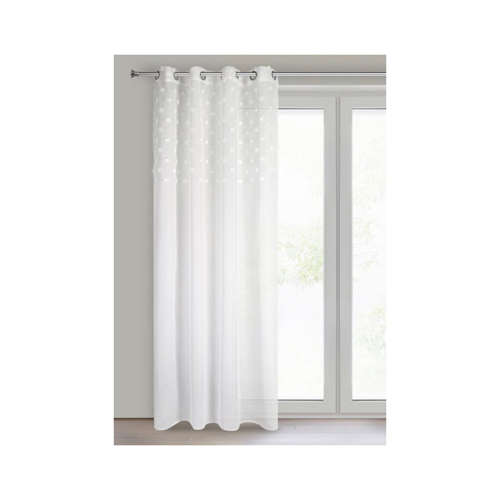 Lehký a vzdušný hotový závěs je po celé ploše zdoben rovnoměrně rozmístěnými bambulkami. Velice snadno se peří, snadno se žehlí. Šířka: 140 cm, délka: 250 cm, barva: bílá, gramáž: 50 GSM, složení: Materiál: 100% polyester.
